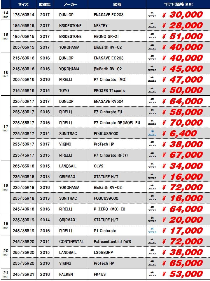 タイヤ代・交換工賃・タイヤ処分代・ゴムバルブ代・窒素充填