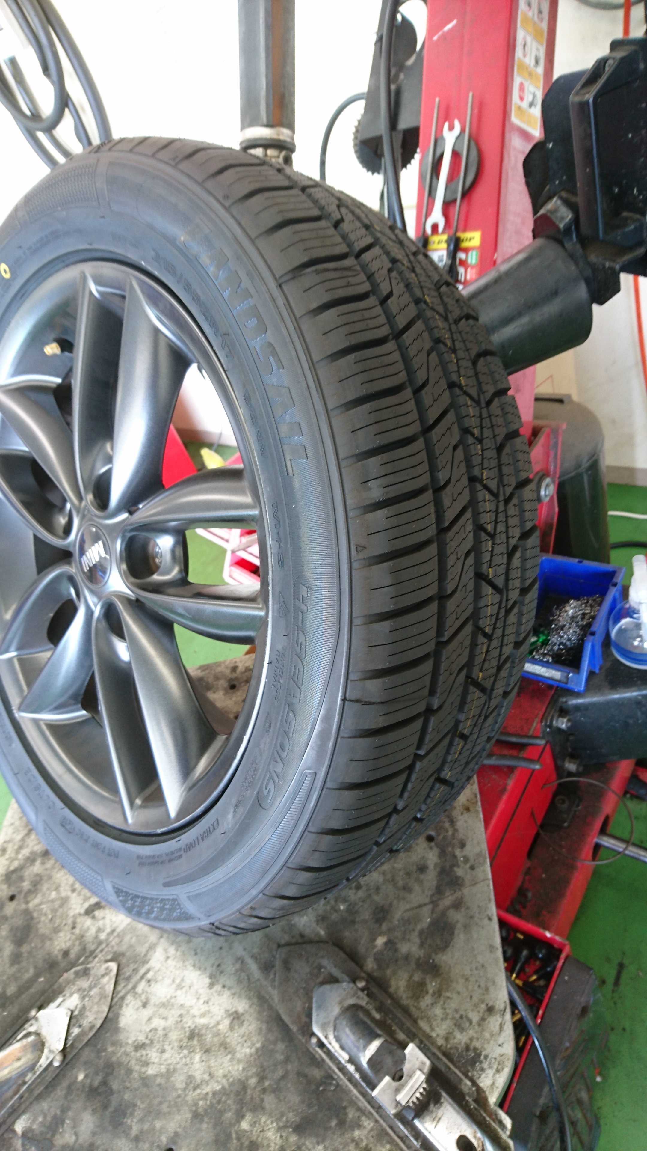 BMWミニにオールシーズンタイヤ装着!!輸入車お乗りのお客様!こんな便利なタイヤがあるんです!夏冬兼用タイヤです(*^_^*)欧州ではメジャーなカテゴリのタイヤですが、日本ではまだまだという状況でしょうか。。今回外形を少し大きくしたいという事で、純正サイズ205/55R17を215/55R17に変更して装着!輸入車はスタッドレス用のホイールも高いので、コスト的にはかなり節約になりますし、夏タイヤとしての性能もしっかり確保されています!冬タイヤとしての性能はバナーをクリック!