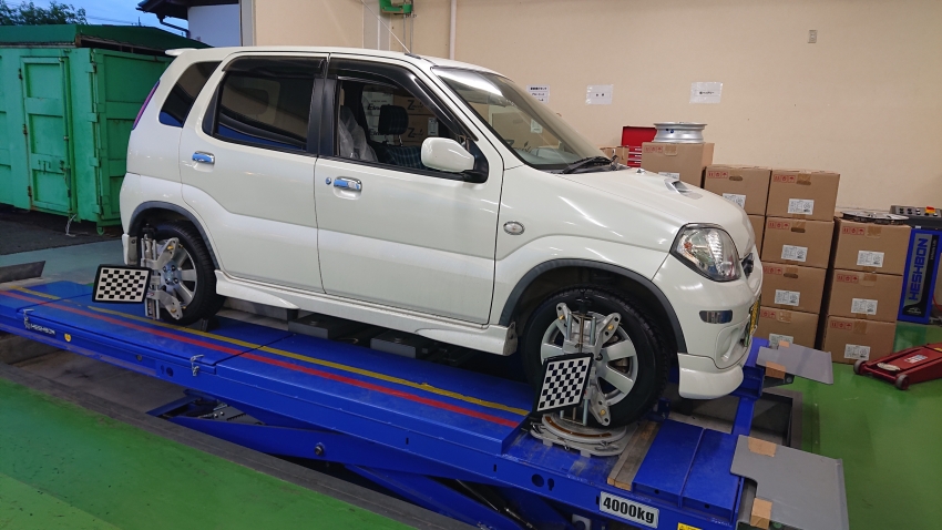 スズキKei ミシュランのオールシーズンの取り付けとアライメント調整を行いました。