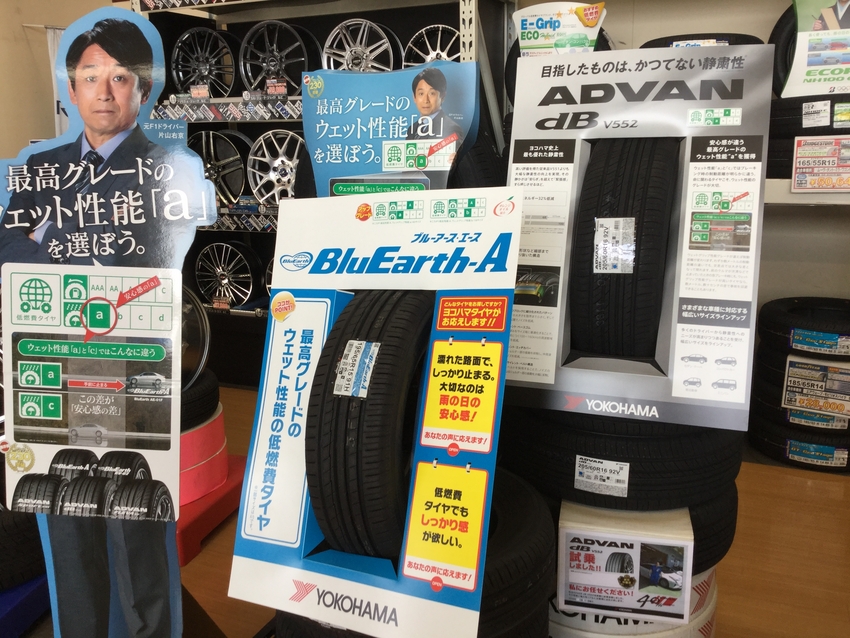 ヨコハマタイヤの最高グレードのウエット性能「a」のタイヤを多数展示中!