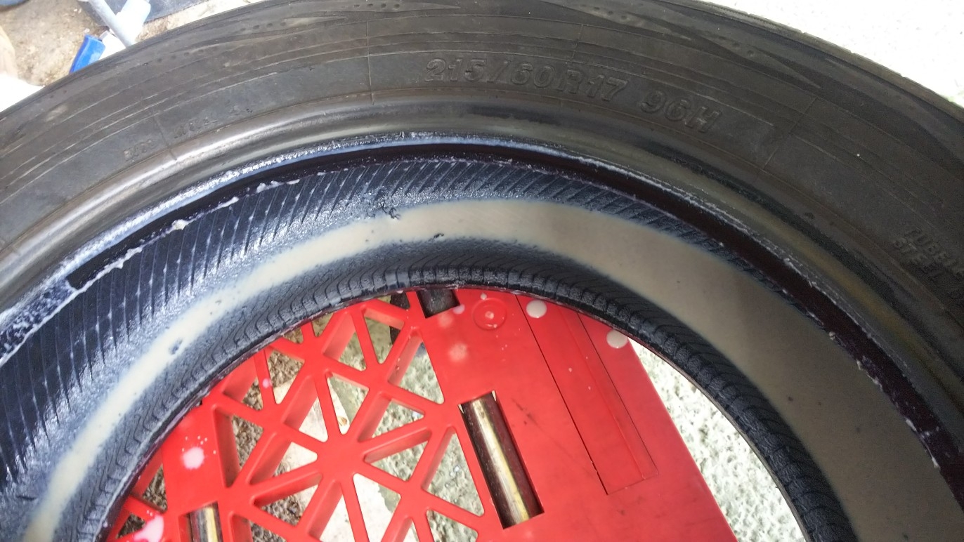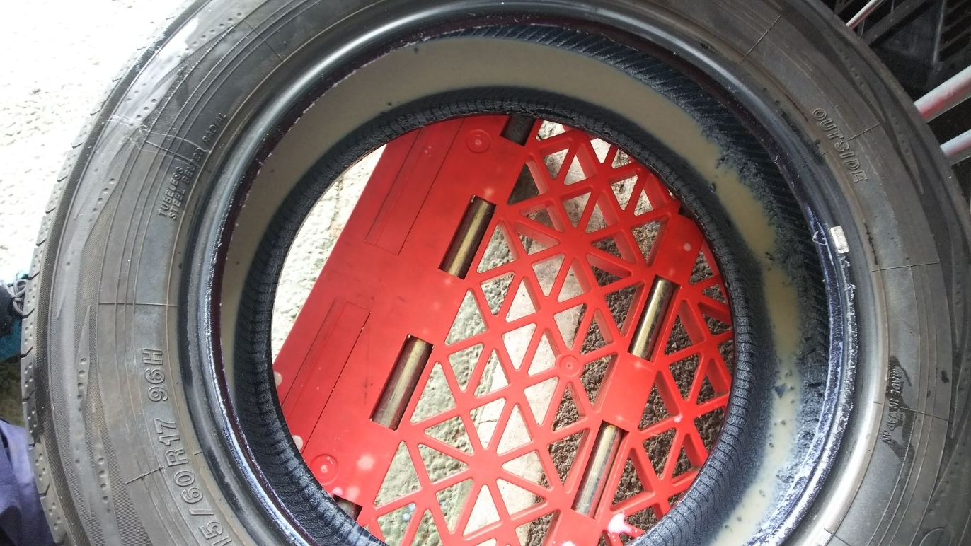 今回パンク修理剤を使われたお客様のタイヤの交換がありましたので中がどのような状態かのご紹介です。(写真参照2)