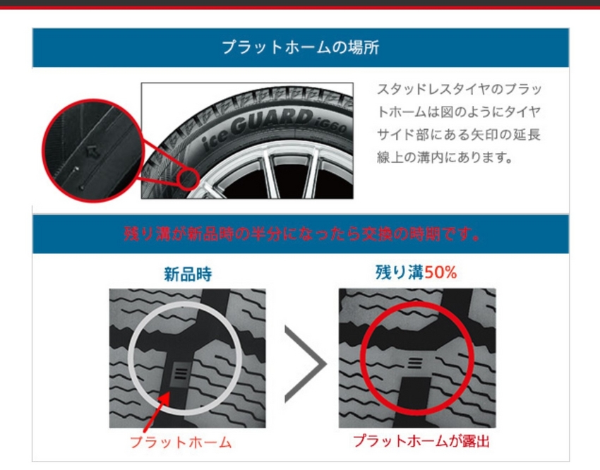 もし「プラットフォーム」が露出していたら、冬タイヤとしては使用できません。スタッドレスタイヤの交換が必要です。