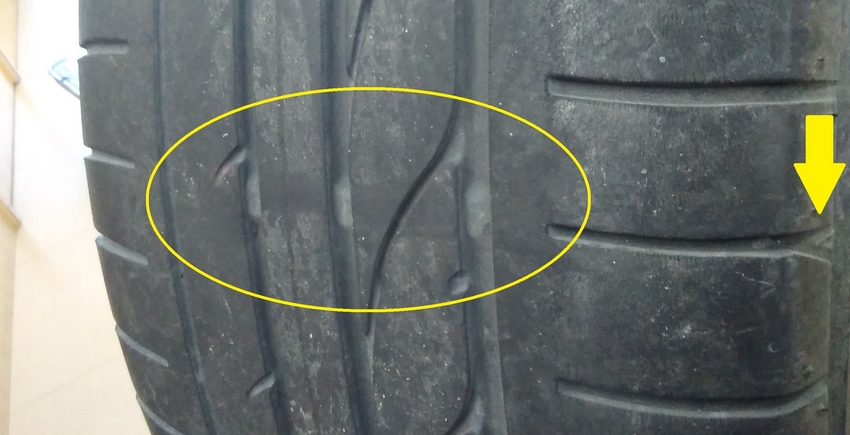 タイヤの横の部分に小さな「△」が、ついています。それをたどっていくと...残溝がわかる凹凸が!