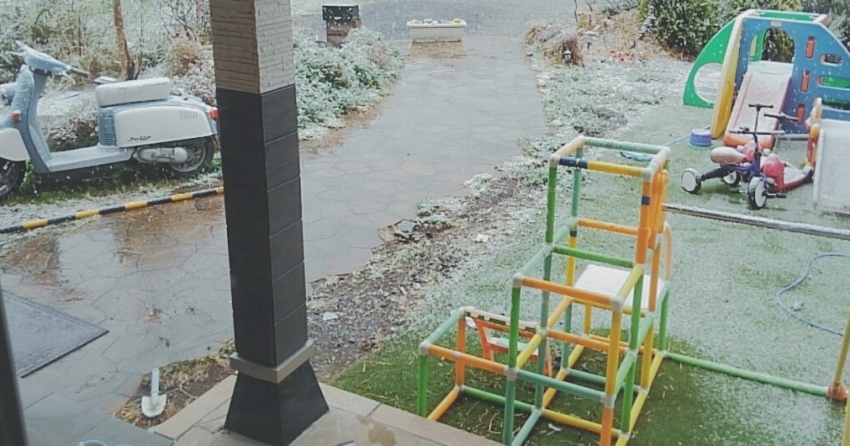 我が家の庭はうっすら白くなって、雪だるまもできました**