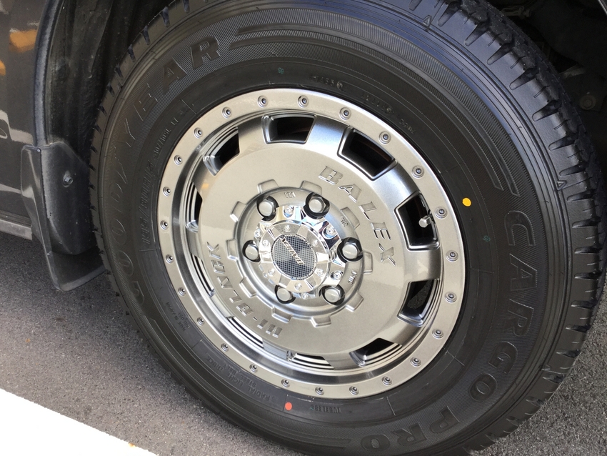 ハイエースではなかなか履いてる方が少ないディッシュタイプのスポークに、オフロード系スタイルのビードロック風のデザインリムがしっかりお車にマッチしていて足元がより引き締まりましたね!!