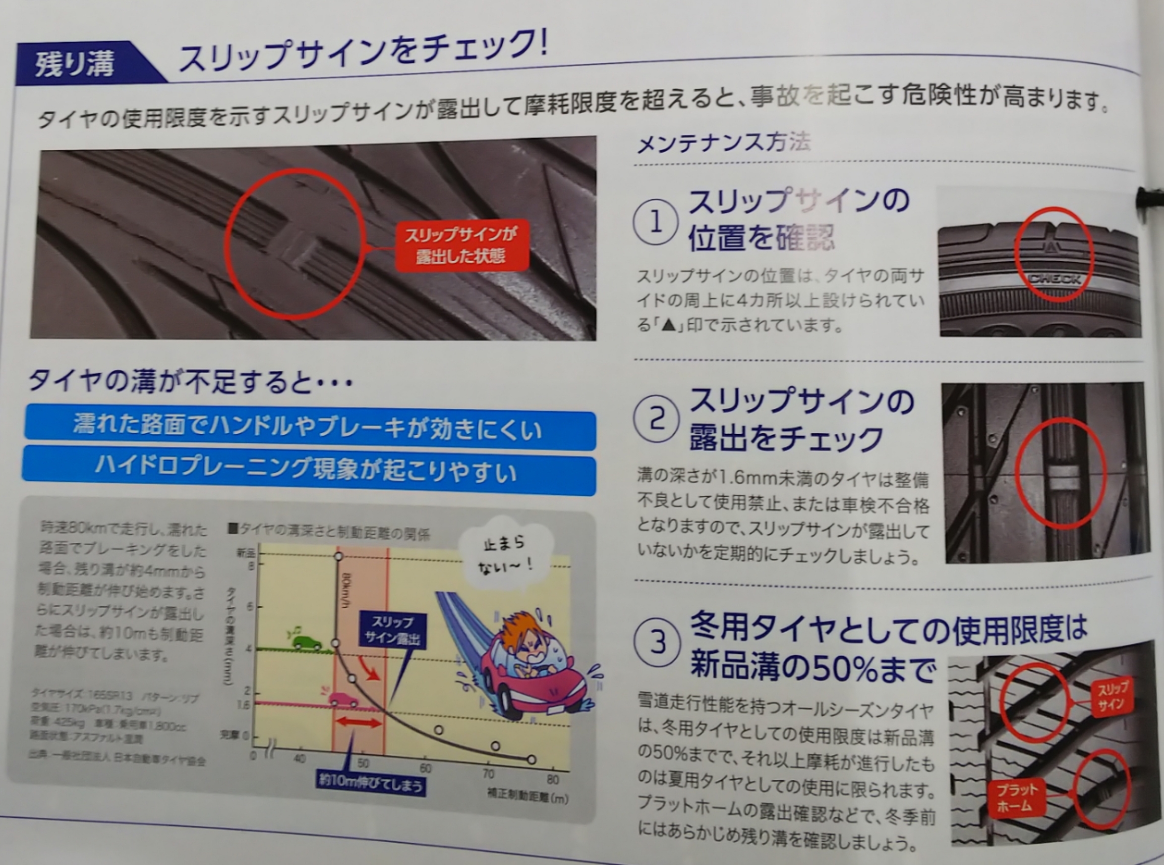 免許を持っている方はご存知かと思いますが、タイヤが外してある今のうちにスリップサインを参考にどれくらい溝が残っているのか必ずチェックしましょう!