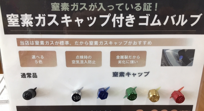 さらに、上記写真にあります空気との入れ間違いを防ぐ 窒素(N2)キャップ。これは当店表示価格に込みとなっており、4本交換頂いたお客様にお付けしております!