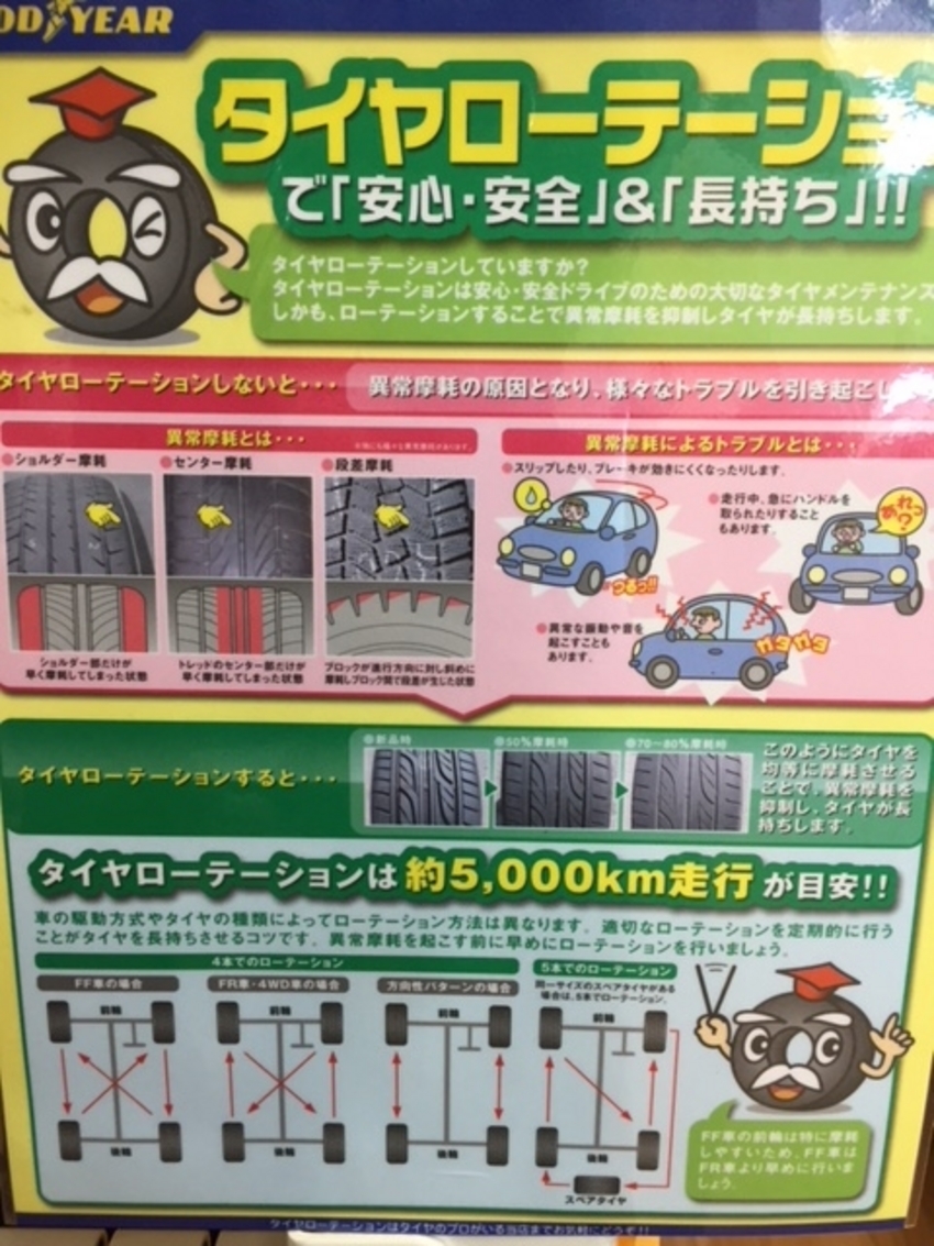 目安は5000km走行毎と言われていますが、必ず5000kmでなくとも10000km、遅くとも15000km以内には一度された方がタイヤが前後均等に減り、長持ちさせることができますよ!