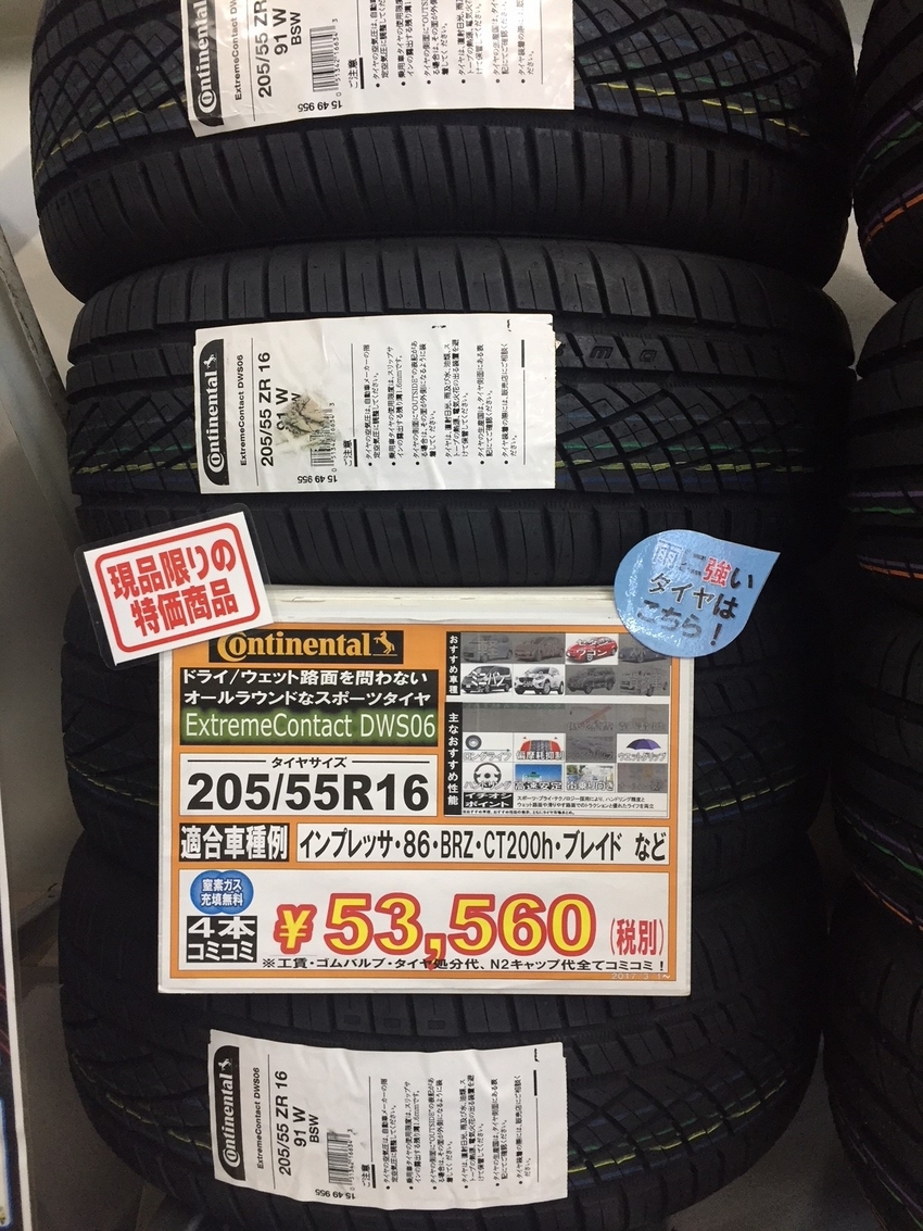 上記写真にありますドイツの高級タイヤメーカーコンチネンタル DWS06 205/55R16 交換工賃等諸費用コミコミ¥53560(税別)