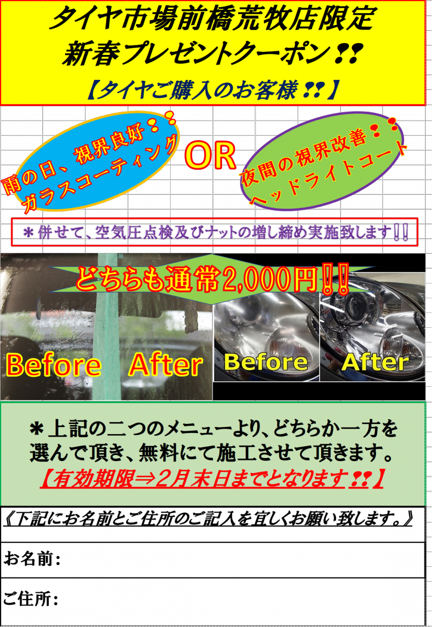 新春企画!!タイヤ4本をご購入のお客様に漏れなくフロントガラスコーティングorヘッドライトコーティングを無料で施工させて頂きます!( ´∀`)b