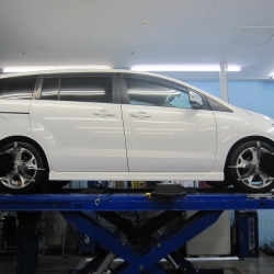 実は、、このお車は数か月前にアライメント調整を行っており、その時にはしっかりと規定値に調整させて頂いたのですが、、左前をぶつけてしまった(゚ω゚)という事で再度診断させて頂く事となりました。