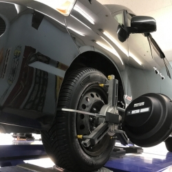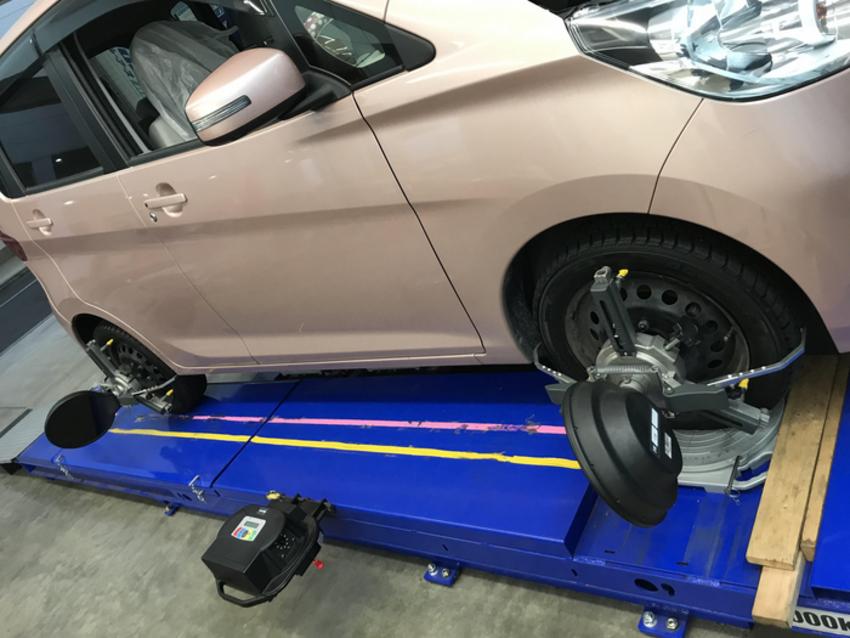 ぶつけてしまった経験の有るお車だそうで、タイヤの偏摩耗も有り、今回の調整をさせて頂いております。