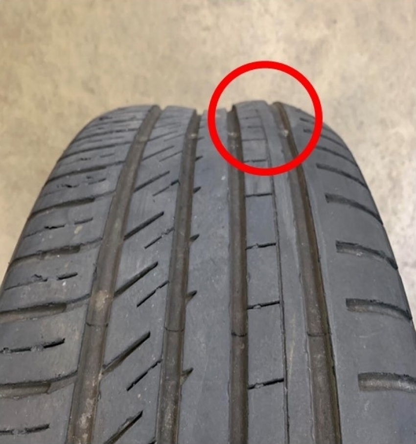 ↑画像の様なタイヤが膨らんでいる場合は、タイヤ内部のコードが損傷しておりその部分だけ耐久性が落ちて内部空気圧にゴムが引っ張られている状況です。