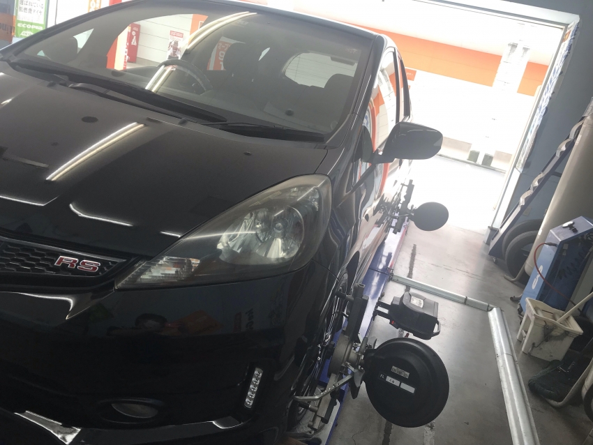 HONDA FITは基本的にはフロントトウの調整のみ行えるお車の為、タイロッドを回して調整していきます。
