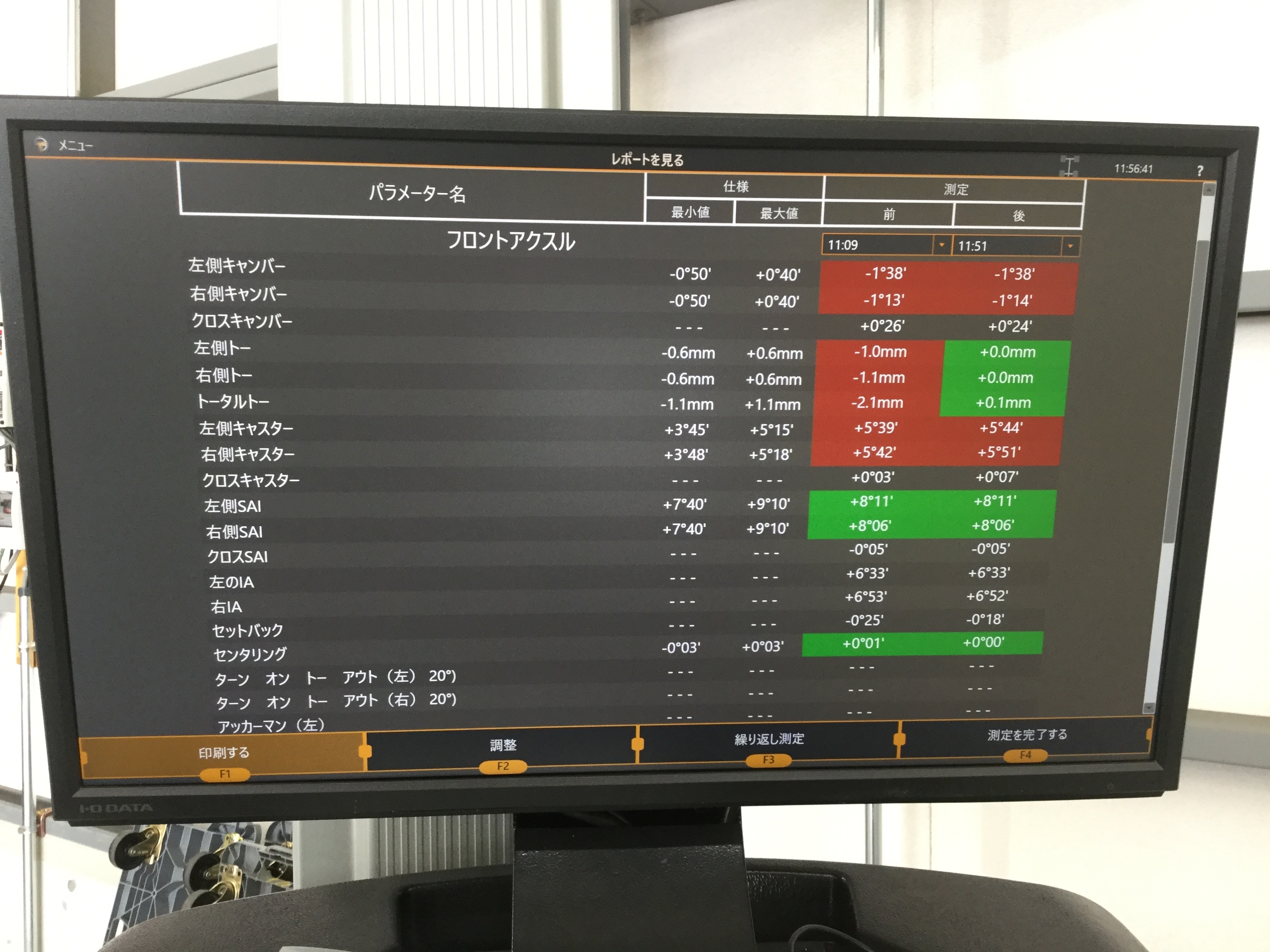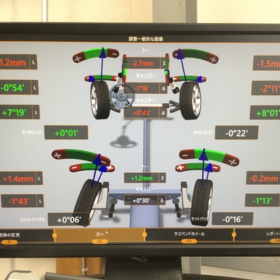 リア(後輪部分)も調節できるタイプのお車だったため、少々お時間がかかってしまいましたが、前後ろきっちりそろえることができました!走り心地など、だいぶ改善されたと思います!