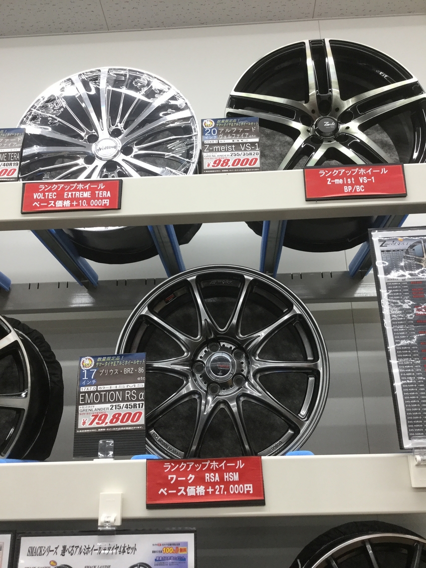 通常のホイールセットでは、当店指定のホイール(複数の種類があればその中から選んでいただく)になるのですが、そこに追加価格を支払って頂くと、ホイールを一つ上のランクに変更することが可能となっています。ホイールの色や形を変えることが可能なので、ご自分のお車に合わせたホイールを選ぶことができます。
