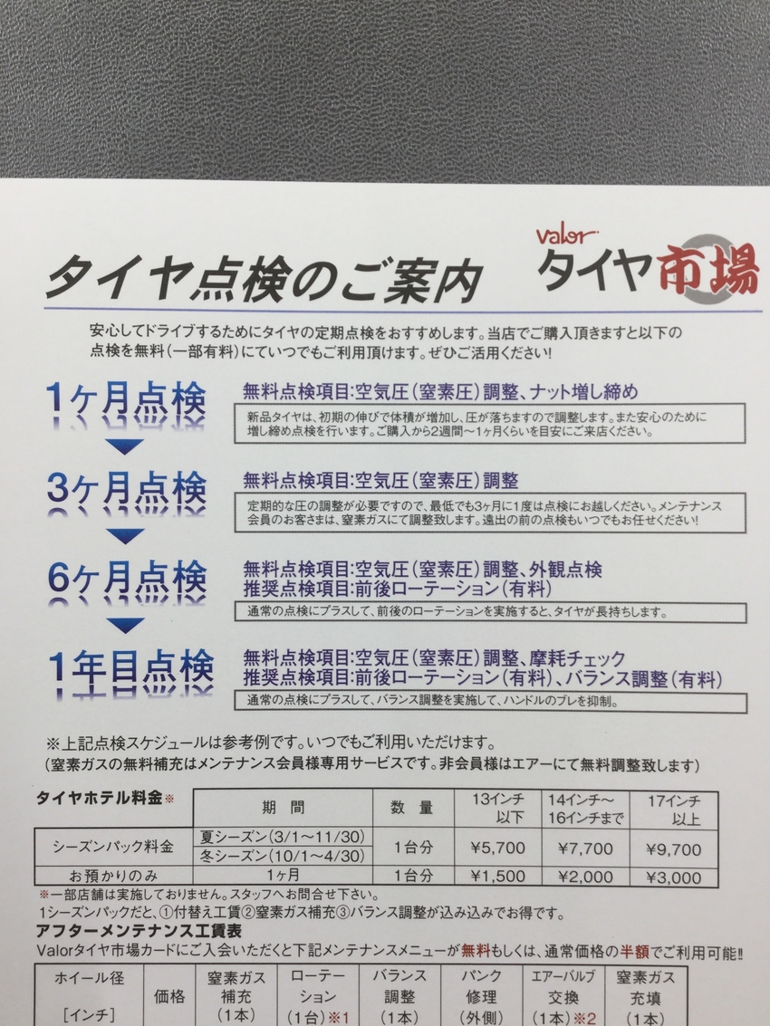 バロータイヤ市場ではタイヤ交換や購入時にメンテナンスシートをお渡しして1カ月点検のご案内をしております。