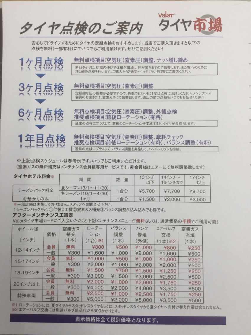 ホームセンターバロータイヤ市場ではタイヤ交換や購入時にメンテナンスシートをお渡しして1カ月点検のご案内をしております。