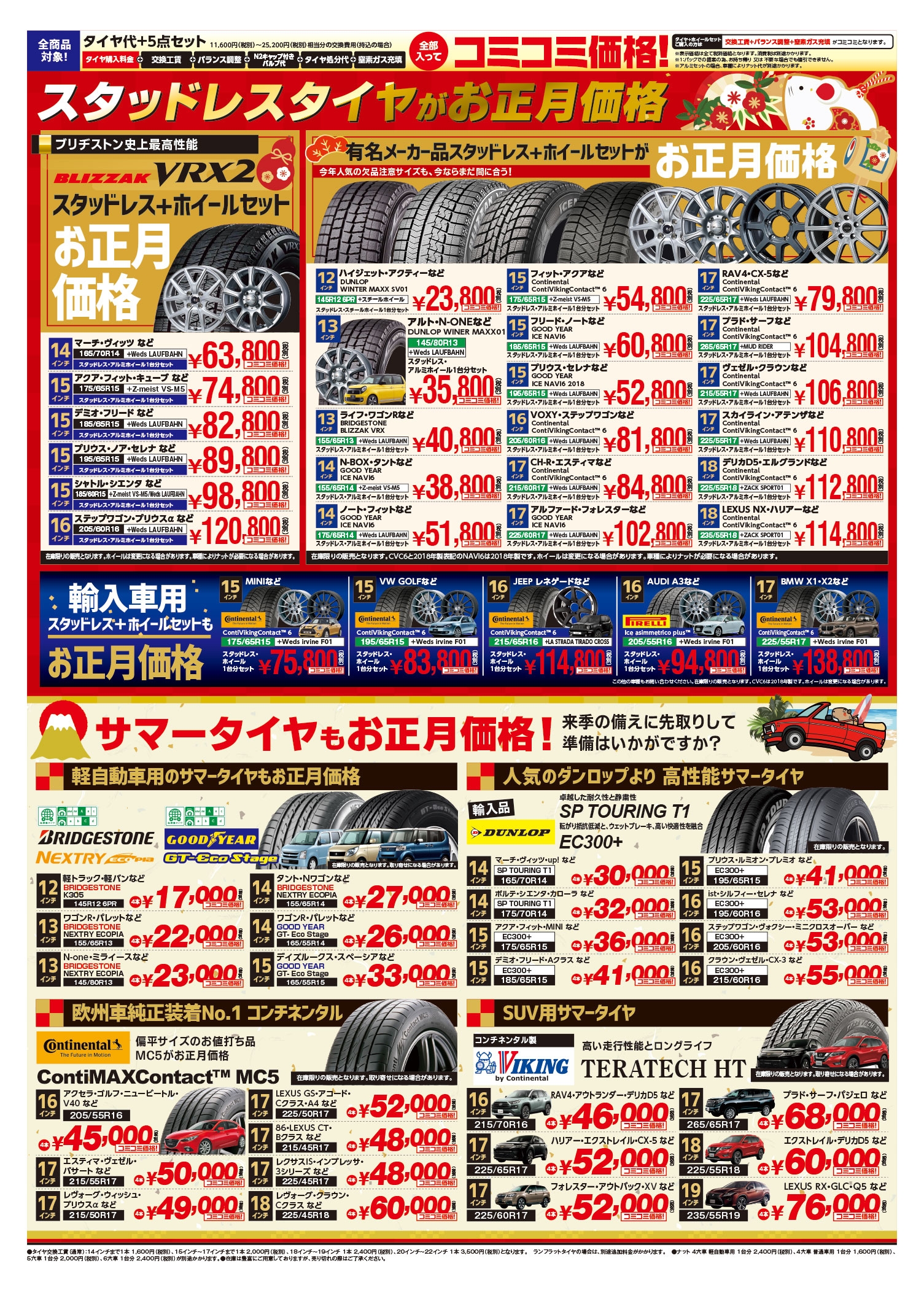サマータイヤ スタッドレスタイヤ さらにはオールシーズンタイヤまで、種類を問わず、お正月価格にて販売させていただいております。まだ、スタッドレスタイヤをご購入されていないお客様。是非この機会に、交換されてみてはいかがでしょうか?