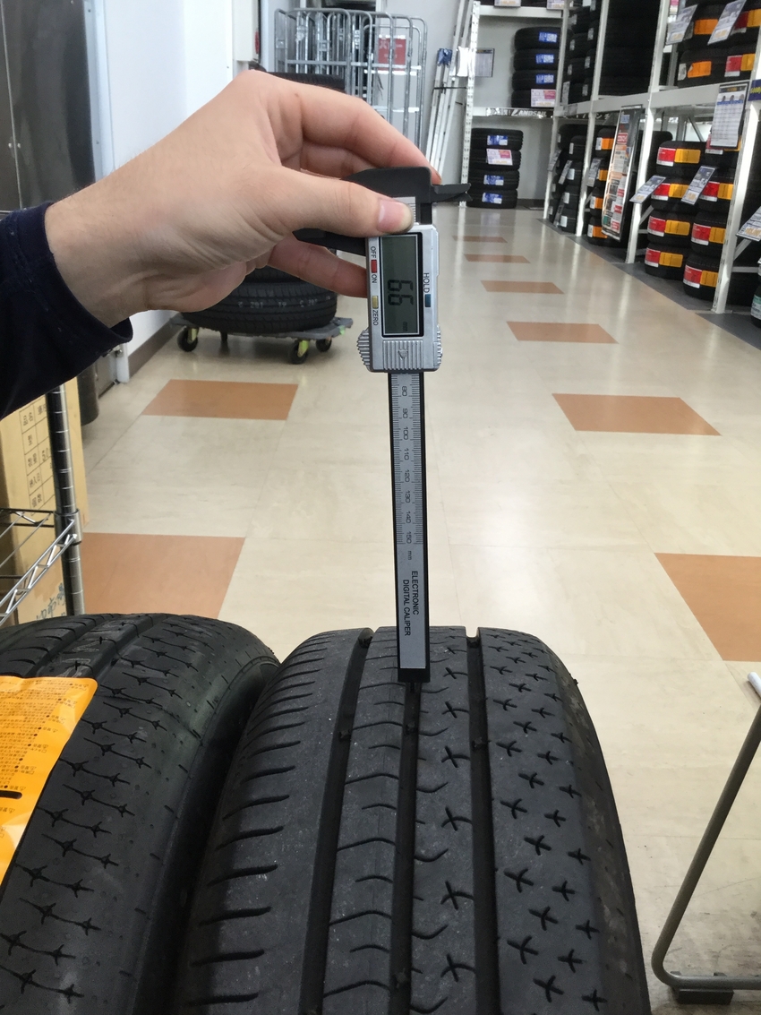 新品の溝8ミリ。残り溝2ミリまでのる。つまり6ミリ削れるまでのる。1ミリで1万キロのれる。
