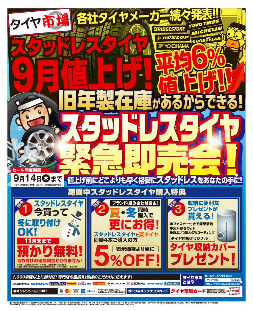ですので、タイヤ市場は9/14(木)まで旧年製スタッドレスセールを
