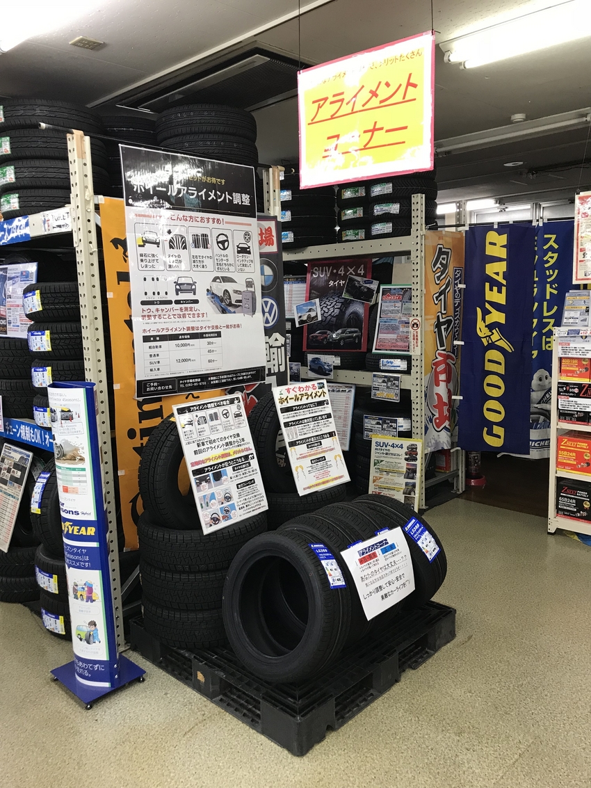 タイヤ市場佐野店では、アライメント導入に先駆けてアライメントの事前予約と