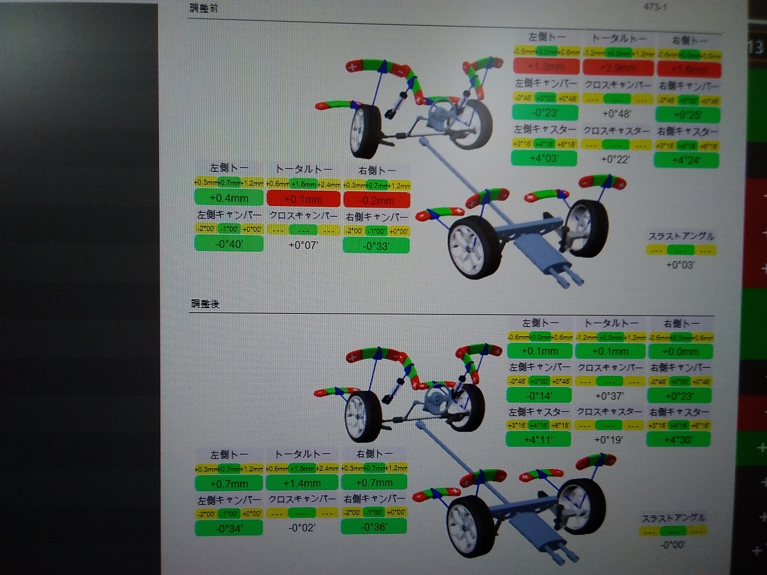 調整行い、フロントリア共に基準値に調整し、偏摩耗も防げるのとタイヤ本来の性能100%発揮できます!!