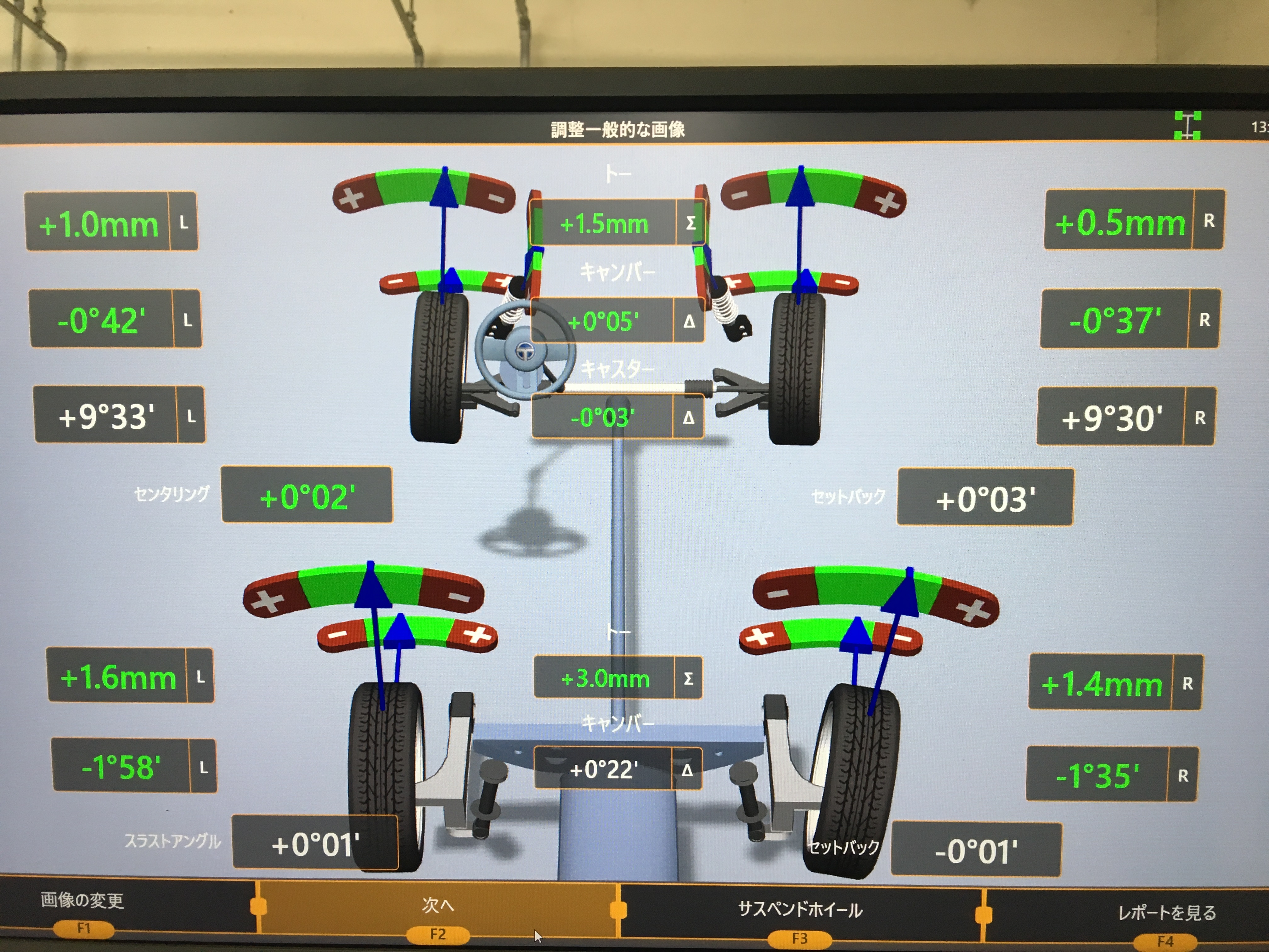 調整後は右前後しっかり基準値内に戻り、正常の状態となりました(*^。^*)