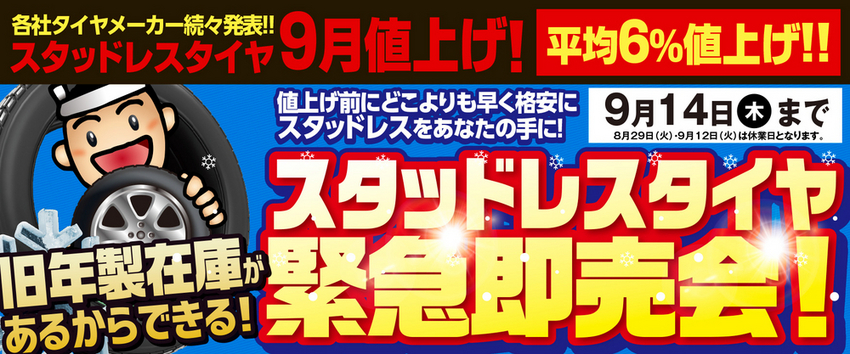 さて、8月度のスタッドレス即売会が大変ご好評いただきましたのでわずかな期間ではございますが