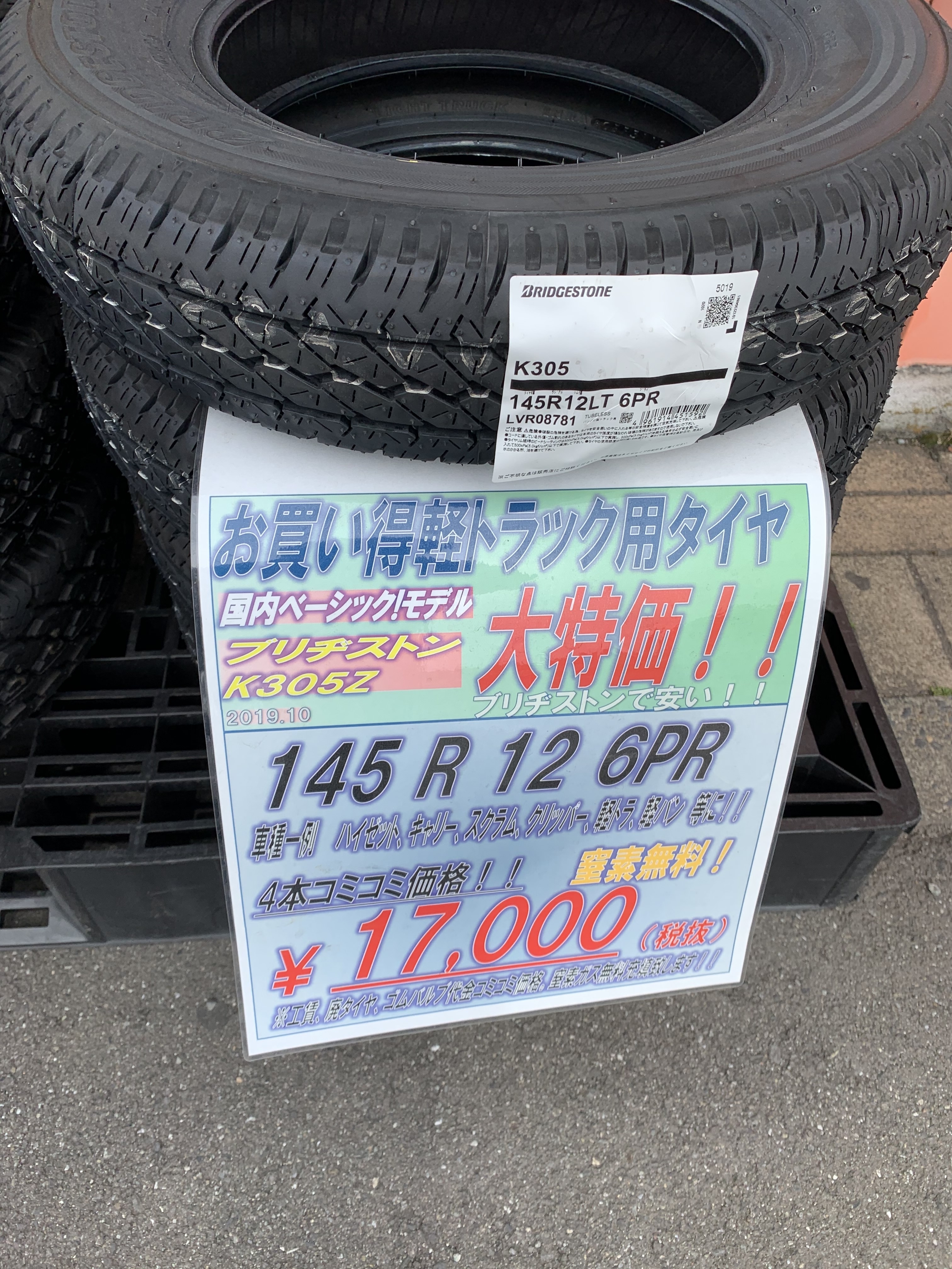 価格:19,000円(タイヤ4本、工賃、バルブ交換、タイヤ処分、バランス調整コミコミ、税込)