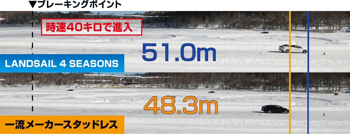 凍結した湖上で、時速40kmから止まれるまでのブレーキ距離比較。※