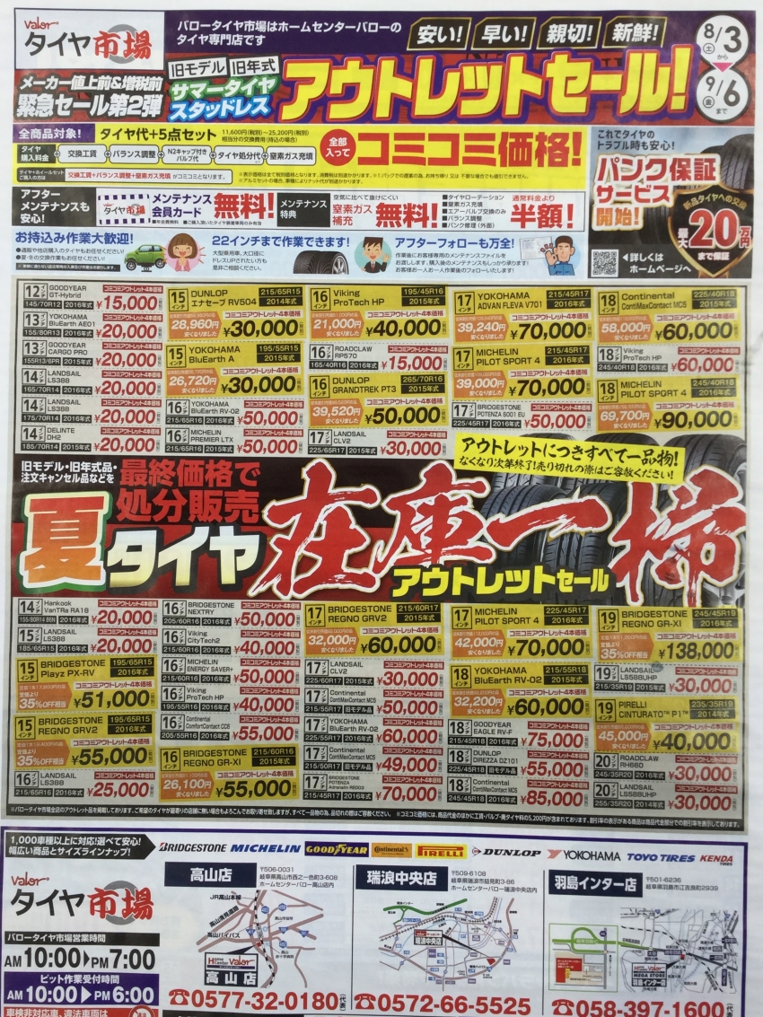 現在タイヤ市場では、タイヤのアウトレットセールを開催しておりますが好評につき在庫が残りわずかとなっております。8月17日時点での在庫状況は下記のとおりとなっております。お早目にご検討ください。