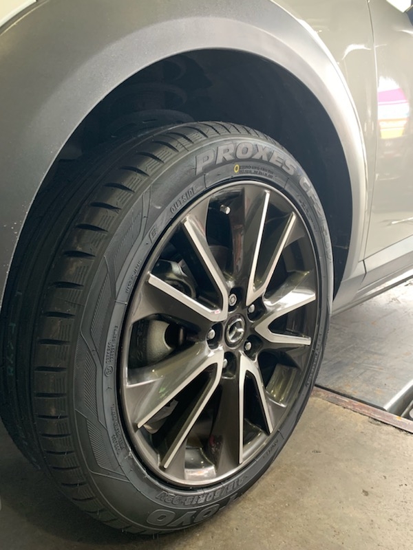さて、今回は雨の中でしたが、CX-3のタイヤ交換作業を紹介します。