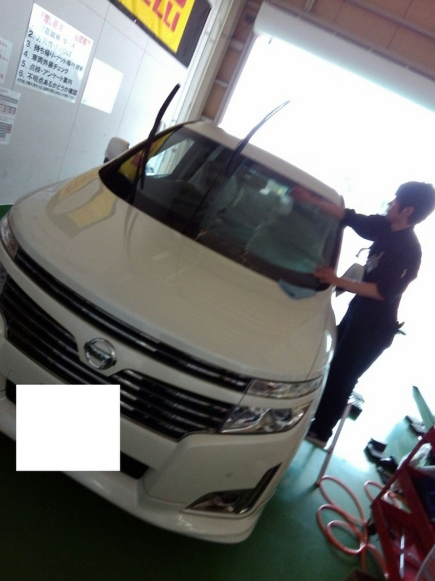 エルグランドのお客様にご来店して頂きました。今回は点検+フロントガラスコーティング作業になります。 しっかりと水が弾くように仕上げさせて頂きます。空気圧もしっかりと見させて頂きました。