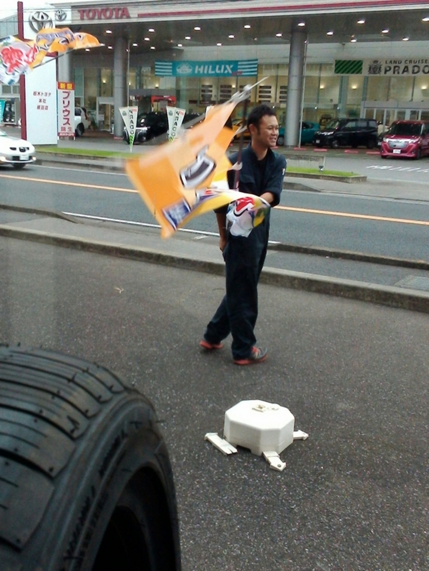 宇都宮近辺にお住まいの方で夏・冬タイヤをお考えの方「当店へ」いかがですか?? 毎日目印の意味を込めて旗振りをしてます!!(笑) 通られた方 よろしければ手を振って頂けると嬉しいです。≧д≦。 皆様のご来店・お問い合わせ心よりお待ちしております。