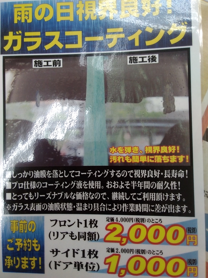 フロントガラスコーティングが半額の¥1,000で施工いたします!!