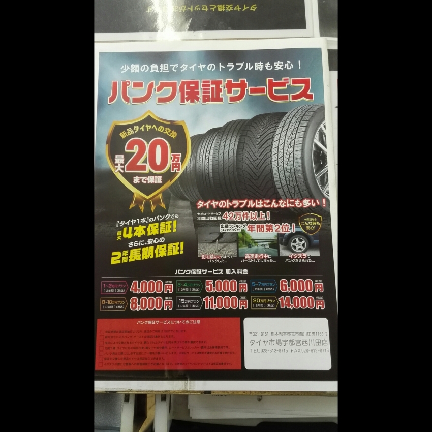 などなど、タイヤが1本パンクしてしまってもタイヤ4本交換ができ、2年間の長期保証がついているサービスになります★